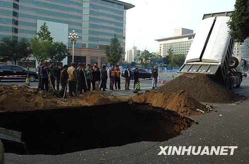 10月17日,北京西長(zhǎng)安街西單文化廣場(chǎng)附近路面發(fā)生塌陷,目前有關(guān)部門正在積極進(jìn)行搶修。新華社記者公磊攝