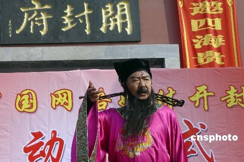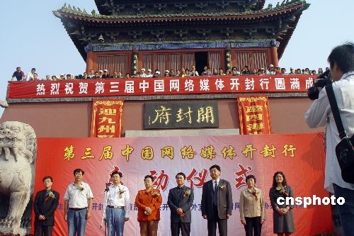 十月十七日,第三屆“中國(guó)網(wǎng)絡(luò)媒體開(kāi)封行”啟動(dòng)儀式在當(dāng)年包公執(zhí)掌的開(kāi)封府前隆重舉行。開(kāi)封是歷史悠久的文化名城,是中國(guó)八大古都之一。戰(zhàn)國(guó)時(shí)期的魏國(guó),五代時(shí)期的后梁、后晉、后漢、后周以及北宋和金七個(gè)王朝曾先后建國(guó)都于開(kāi)封,故稱“七朝都會(huì)”。中新社發(fā) 李志全 攝