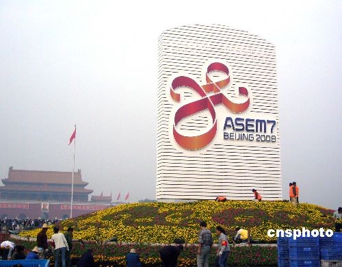 圖:第七屆亞歐首腦會議標(biāo)識亮相天安門