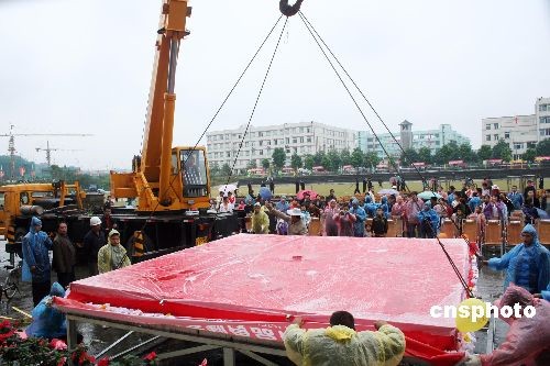 10月26日下午,四川省南溪縣豆腐干食品文化節(jié)現(xiàn)場,一塊長4.21米、寬4.2米、高9.5厘米左右,重達1.8噸左右的巨型豆腐干特別引人注目,它將于26日晚間揭開紅蓋頭,申報世界吉尼斯紀(jì)錄。 南溪豆腐干制作工藝因技術(shù)獨特、工藝的傳承人缺乏等原因,已被列入四川省首批非物質(zhì)文化遺產(chǎn)目錄。這次試制的巨型豆腐干全部按照豆腐干傳統(tǒng)工藝制作。數(shù)十名技術(shù)骨干和工人經(jīng)30多個小時的辛勤勞作,共使用了黃豆1300余公斤。中新社發(fā) 陳涌 攝