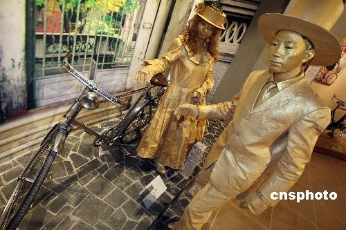 10月28日,行為藝術(shù)者在河北省霸州市新落成的華夏民間收藏館自行車博物館內(nèi)表演,表演者倚靠的是著名民間收藏家王明璽老人收藏的1910年英國(guó)生產(chǎn)的白金人牌自行車。該車只生產(chǎn)了100輛,進(jìn)入中國(guó)10輛,這是目前發(fā)現(xiàn)保存最為完好的一輛。當(dāng)日,第二屆霸州文化藝術(shù)節(jié)在河北省霸州市隆重開(kāi)幕。中新社發(fā) 毛建軍 攝
