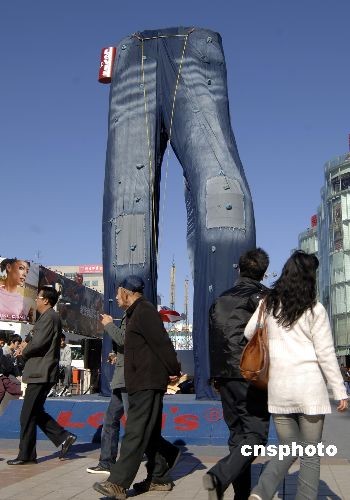 10月31日,北京王府井金街上的某商家樹(shù)起巨型牛仔褲招牌造型,吸引路人目光。在全球金融危機(jī)大背景下,眾多商家不得不利用各種新奇手法賺人眼球。中新社發(fā) 徐曦弋 攝