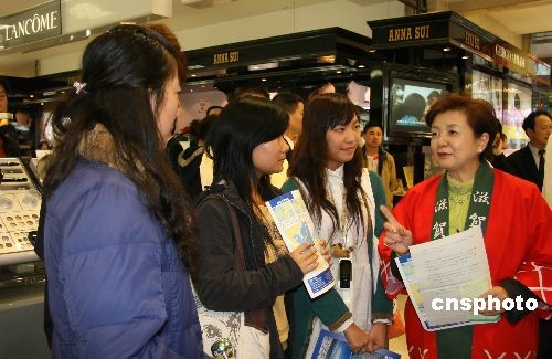 10月31日,日本滋賀縣知事嘉田由紀(jì)子在湖南平和堂商場向消費(fèi)者推介滋賀縣的旅游資源。當(dāng)天,日本滋賀縣在長沙舉行了旅游推介大會(huì),盛邀洞庭湖的居民到日本游覽琵琶湖。由于該縣一些主要景點(diǎn)都是模仿湖南的“瀟湘八景”而命名,引起了與會(huì)人員的強(qiáng)烈興趣。中新社發(fā) 鄧霞 攝