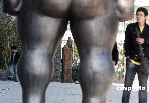 11月2日,北京大學(xué)光華管理學(xué)院新樓門前,中央美術(shù)學(xué)院雕塑系兩位老師申紅飆于2008年創(chuàng)作的《蒙古漢——站》,田世新于2003年創(chuàng)作的《剛?cè)嶂馈献酉瘛,吸引過往行人的目光。這兩尊雕塑,一尊是逾3米高、露生殖器的壯漢,一尊則是張嘴露齒的老子雕像,它們相對(duì)而立,近日引發(fā)爭(zhēng)議。中新社發(fā) 鄭雄增 攝