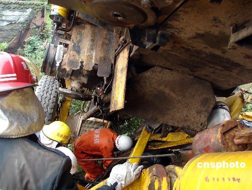 11月2日11時50分許,渝黔高速公路重慶至一品段10公里處,一輛長江牌吊車因爆胎導(dǎo)致車輛失控,沖出護欄發(fā)生側(cè)翻,造成1人死亡,1人重傷。圖為消防人員緊急施救。中新社發(fā) 郭晉嘉 攝