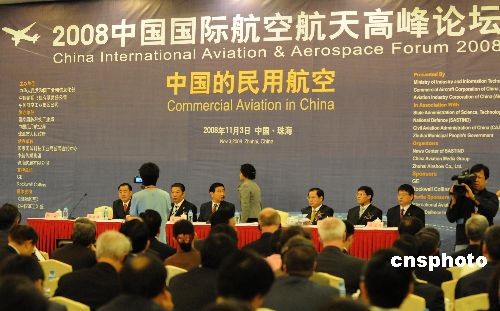 十一月三日,珠海航展開幕前夕,由中國工業(yè)和信息化部、中國商飛公司、中國航空工業(yè)集團(tuán)公司共同主辦的二零零八中國國際航空航天高峰論壇在珠海舉行,論壇分“中國民用航空發(fā)展線路圖”、“通用航空與區(qū)域航空的發(fā)展”兩個(gè)單元,中外航空航天界近三百名精英人士相聚一堂,共商未來發(fā)展大計(jì)。中新社發(fā) 孫自法 攝
