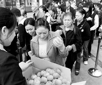 11月2日上午,成都大型賣場紛紛開門營業(yè)時,由省農(nóng)業(yè)廳等單位共同組織的“萬人免費(fèi)品嘗柑橘活動”也正式在各家賣場啟動。在春熙路一大型賣場內(nèi),當(dāng)市民們爭相走向免費(fèi)品嘗點(diǎn)時,農(nóng)業(yè)部副部長陳曉華、副省長張作哈、省農(nóng)業(yè)廳廳長任永昌等領(lǐng)導(dǎo)也走到了柑橘品嘗點(diǎn)前,細(xì)細(xì)品嘗起這些剛從果農(nóng)柑橘園子中摘下的新鮮柑橘。在他們的帶領(lǐng)下,原本購物的市民也紛紛停下腳步,走到了品嘗點(diǎn)品嘗柑橘!澳壳笆袌錾系拈僮,包括今天免費(fèi)品嘗的20噸橘子都是經(jīng)過了相關(guān)部門檢驗(yàn)的,絕對沒有問題,而且品質(zhì)很好!笔∞r(nóng)業(yè)廳廳長任永昌表示。