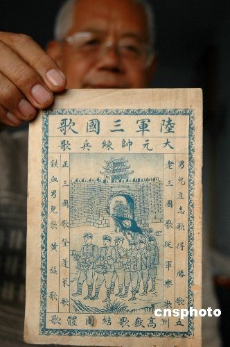 2008年11月4日,一本塵封80年民國年間出版的張作霖《大元帥練兵歌》在山東濱州無棣面世。該書1928年由天津河?xùn)|特制、聚文山房發(fā)行!洞笤獛浘毐琛烦氖敲駠埠,夸的是本軍統(tǒng)帥,說的是當(dāng)兵意義,真實記錄了奉軍出操、練兵、行軍、打仗的場景。令人驚奇的是,被毛澤東反復(fù)推薦的紅軍歌曲《三大紀(jì)律八項注意》的曲調(diào),竟是張作霖的《大元帥練兵歌》。中新社發(fā) 梁寶海 攝
