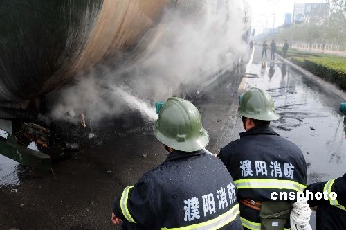11月5日上午,位于河南省濮陽市濮鶴高速收費站東一公里處,一輛從河北省邯鄲市往濮陽市運輸散裝水泥原料潮石粉的歐曼重型卡車剛下高速公路,正在行駛時突然發(fā)生輪胎著火事故。在當?shù)叵拦俦目焖偬幹孟,火災得到及時撲滅。中新社發(fā) 劉敬寬 攝