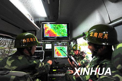 在云南楚雄等地發(fā)生滑坡泥石流災害后,云南民兵預備役應急通信分隊派出安裝著地理信息、GPS定位、衛(wèi)星圖像傳輸、微波無線通信等車載工作系統(tǒng)組合的移動指揮車及數輛前方信息偵察車,用科技手段為救災工作提供精確信息和清晰圖像。新華社記者 陳海寧 攝