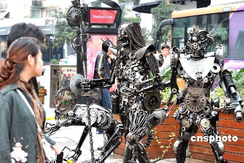 11月8日,由裝置藝術(shù)家周峰先生創(chuàng)作的九件“汽車零件機器人”在浙江杭州西湖創(chuàng)意市集上首次集中展示,嶄新的藝術(shù)創(chuàng)作形式吸引了眾多的眼球。據(jù)了解,近年來,作者大量收集汽車、摩托車上的廢舊金屬零件進行焊接組合,創(chuàng)作了無敵戰(zhàn)士、恐龍、眼鏡蛇等一批風(fēng)格獨特的“機器人”。中新社發(fā) 李忠1 攝