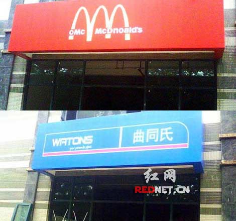 紅網(wǎng)長沙11月9日訊(記者 耿紅仁)“這擦邊球打得很牛很雷人,真是山寨店鋪大薈萃。 8日晚上,網(wǎng)友“鍋爐工”在紅網(wǎng)論壇發(fā)帖爆料,稱在網(wǎng)上看到一個題為《對不起,我真的被雷到了,南京最雷人山寨店群》的圖片帖,圖片顯示在南京文安街上,林立的店鋪清一色是山寨名牌店鋪,其中屈臣氏、必勝客、麥當(dāng)勞、李寧、星巴克、哈根達斯等分別被克隆成曲同氏、必勝糊、李明、巴克星、哈根波斯等。
