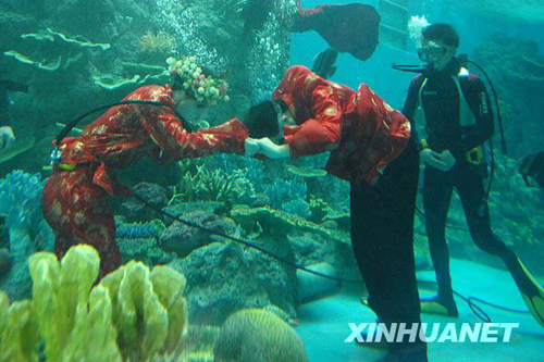 11月8日,在合肥漢海極地海洋世界,一對新人身著特制的中式禮服,在由專業(yè)潛水員擔(dān)任的伴郎、伴娘陪伴下,在“海底”完成了一場浪漫、奇妙的婚禮。