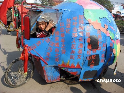 11月10日,一個(gè)地球模樣的三輪車來到安徽省亳州市宣傳環(huán)保,吸引市民駐足觀看。38歲的江西小伙蔣桂山自去年6月5日從江西九江開始,騎著自制的直徑一米的地球儀三輪房車宣傳環(huán)保,先后途經(jīng)上海、天津等140個(gè)城市。之后,他來到安徽亳州講“環(huán)!。蔣桂山預(yù)計(jì)用4年時(shí)間蹬著“地球車”走遍全國400多個(gè)城市,向人們宣傳節(jié)約用水、用電和能源,他想用這種特殊的方式引起人們關(guān)注環(huán)保。中新社發(fā) 張延林 攝