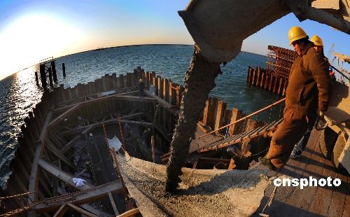 背景資料:曹妃甸特大橋是遷曹鐵路全線重點控制工程,全長7477.26m,為雙線橋梁,包括下部結(jié)構(gòu)樁基1973根、橋墩臺243個,以及相應(yīng)施工便道、筑島平臺填筑和跨1400m的納潮河段施工棧橋、平臺搭設(shè);上部結(jié)構(gòu)現(xiàn)澆4處15孔共339.44m,架設(shè)預制梁227孔?缂{潮河段水深6至18m,納潮河主跨連續(xù)箱梁施工是重中之重,原設(shè)計為(40+64+40)分段懸臂澆注施工。該工程于2008年4月中旬開工,面對工期緊、任務(wù)重、安全和質(zhì)量風險大等諸多重難點問題,從集團公司到項目部各級領(lǐng)導高度重視,層層發(fā)動,統(tǒng)一思想;著力加強現(xiàn)場組織領(lǐng)導力量,加大施工現(xiàn)場人力、物力的投入;不斷優(yōu)化施工方案,嚴控布控,精心組織,科學施工,全力攻堅。先后組織了“百日大干,任務(wù)過半”、“決戰(zhàn)60天,貫通曹西線”等建功立業(yè)競賽活動,目前已完成實物工作量95%,預計2008年底全線貫通。中新社發(fā) 朱鴻山 攝