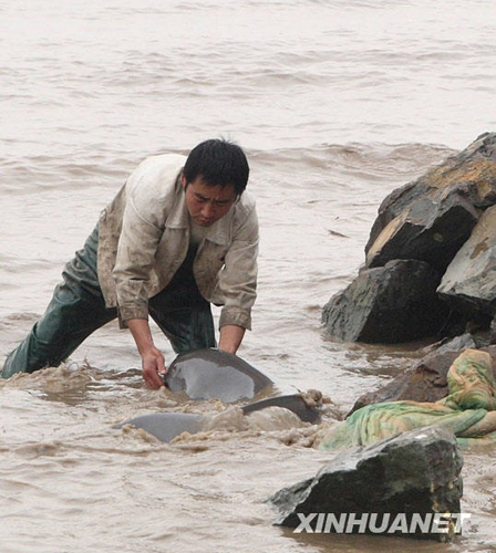 11月12日,3位漁民借助棉被將擱淺江豚轉(zhuǎn)移到安全地帶。 當(dāng)日,在杭州灣海鹽段灘涂,一條擱淺江豚在3位漁民的及時(shí)幫助下,重回大海。新華社發(fā)