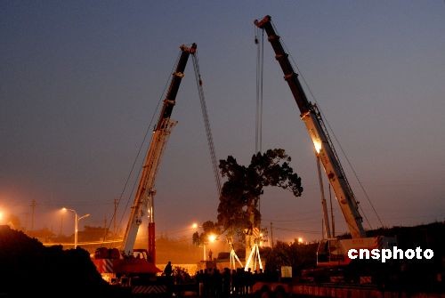 11月13日,江蘇鎮(zhèn)江市工人正為一棵有著400多年樹齡的古柏樹起吊搬家。據(jù)了解,在此施工中的國家重點(diǎn)工程京滬高速鐵路正好從這棵古柏處經(jīng)過,為確保這棵被列為國家一級古樹名木的古柏成活,有關(guān)部門專門制定了整體移栽方案。 中新社發(fā) 陳崗 攝