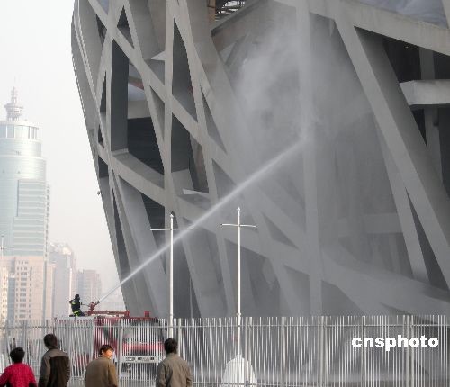 11月14日, 國(guó)家體育場(chǎng)“鳥(niǎo)巢”的鋼結(jié)構(gòu)迎來(lái)了北京奧運(yùn)會(huì)結(jié)束后的第一次全面清洗。負(fù)責(zé)此次清洗任務(wù)的奧林匹克中心區(qū)消防支隊(duì)出動(dòng)了兩輛消防車(chē)及68米的云梯,使用高壓水槍進(jìn)行清洗作業(yè)。預(yù)計(jì)整個(gè)“鳥(niǎo)巢”的清洗工作大約需要1周的時(shí)間。中新社發(fā) 玉龍 攝