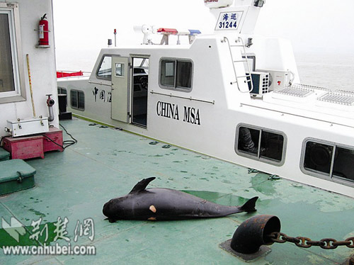 昨日中午,武漢海事局執(zhí)法人員在長江龍口水道巡航時,發(fā)現(xiàn)一具江豚的尸體。嘉魚縣漁政局技術(shù)人員趕來,經(jīng)鑒定,該江豚體長1.45米,重約60公斤,身上有明顯的捕魚器具傷痕,是致其死亡的直接原因。