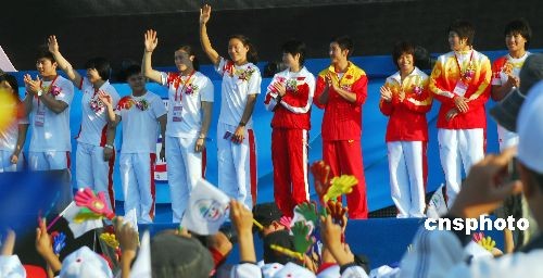 2008年11月16日,第九屆中國(guó)海南島歡樂節(jié)在文昌市開幕。當(dāng)日,奧運(yùn)冠軍、著名歌手、神七宇航員等眾多各類明星云集文昌,在歡樂節(jié)主會(huì)場(chǎng)開幕式上亮相,為歡樂節(jié)助興,傳遞節(jié)日的歡樂。中新社發(fā) 善平 攝