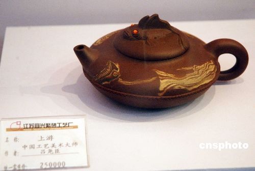 2008年11月18日,福建武夷山第二屆海峽兩岸茶業(yè)博覽會上,來自江蘇宜興售價高達(dá)250000元的天價紫砂壺吸引了許多紫砂壺愛好者前來觀賞。中新社發(fā) 張 斌 攝