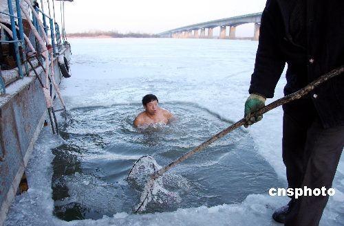 11月20日,哈爾濱公路大橋西側黑龍江省冬泳協會冰窟池,游泳會長王利敏在冰窟窿里撈冰,準備按計劃鑿開一個長50米,寬20米的冬泳池。中新社發(fā) 姚庭山 攝