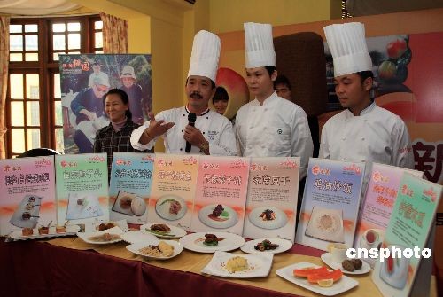 11月21日,被視為吸引大陸客“金字招牌”的臺(tái)灣“蔣家菜”,在蔣宋聯(lián)姻的上!皭蹚]”旁的一餐廳高調(diào)亮相。來自臺(tái)灣桃園的大廚,在此一展寶島版“蔣家菜”的正宗烹調(diào)功夫!笆Y家菜”菜譜是海蜇絲筍、雪菜百葉毛豆、家常豆干、白菜獅子頭、沙參玉竹燉雞湯、無(wú)錫嫩子排、蒜子燒黃魚、雞油炒飯、養(yǎng)生牛肉茶、烤奉化芋頭、檸檬木瓜。美味佳肴涵蓋蔣介石的偏愛、蔣緯國(guó)喜好以及宋美齡的美容養(yǎng)生。據(jù)悉,正宗的一份桃園“蔣家菜”套餐,約合新臺(tái)幣五百元左右,針對(duì)大陸團(tuán),當(dāng)?shù)匾淹瞥龈鞣N優(yōu)惠。中新社發(fā) 潘索菲 攝
