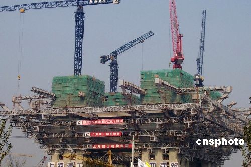 2008年11月25日,正在建設(shè)中的上海世博會(huì)中國館已初露雄姿,據(jù)悉計(jì)劃2009年年底竣工。 中新社發(fā) 周東潮 攝