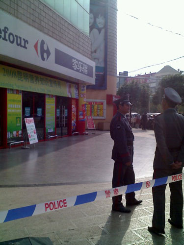 29日上午,云南省昆明市龍泉路家樂福超市發(fā)生人質(zhì)劫持事件,3名市民被歹徒刺傷,1人被劫持。經(jīng)多方談判未果,為保護(hù)人質(zhì),警方開槍擊斃歹徒。