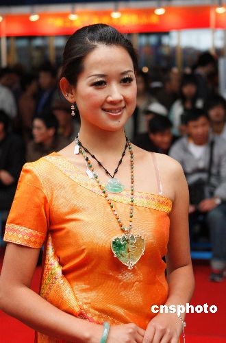 圖為身著盛裝的傣族少女展示一款玉石項鏈。