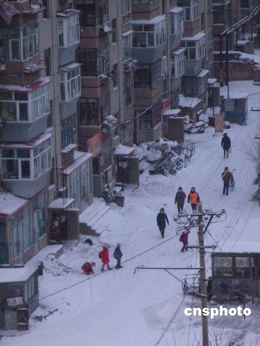 2008年12月4日,齊齊哈爾市再次降雪,城市銀裝素裹。當?shù)貧庀笈_發(fā)布藍色寒潮預警信號,提醒市民做好預防寒潮準備。齊齊哈爾市已經(jīng)連續(xù)兩天降雪,降雪給城市交通帶來了不便,車輛紛紛緩行,市民忙著清掃道路上的積雪。中新社發(fā) 王云龍 攝