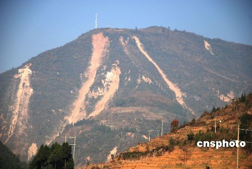 12月,在四川青川縣關(guān)莊鎮(zhèn)的白石河停車場可以清晰地看到遠(yuǎn)山滑坡體垮出的“青川”二字。中新社發(fā) 熊芙蓉 攝