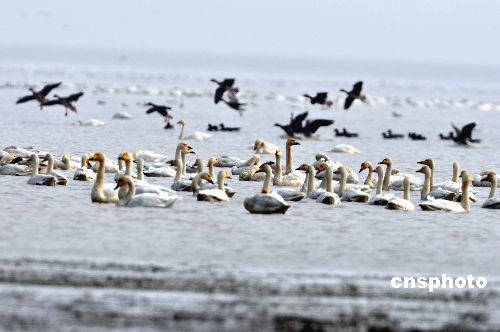 十二月十四日,數(shù)萬(wàn)只小天鵝、雁類等珍禽候鳥(niǎo)在鄱陽(yáng)湖候鳥(niǎo)保護(hù)區(qū)江西星子縣沙湖山沙湖池越冬棲息。入冬以來(lái),中國(guó)第一大淡水湖江西鄱陽(yáng)湖區(qū)八大湖池越冬棲息的珍禽候鳥(niǎo)總數(shù)已逾過(guò)十萬(wàn)只,包括白鶴、白鸛等國(guó)家一級(jí)保護(hù)鳥(niǎo)類,以及雁類、鷸類、小天鵝、野鴨等珍禽候鳥(niǎo)。目前每天仍有眾多候鳥(niǎo)從中國(guó)北方等地陸續(xù)飛抵鄱陽(yáng)湖越冬。中新社發(fā) 段長(zhǎng)征 攝