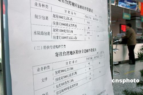 12月15日,海峽兩岸全面直接通郵正式開通,目前,各項準備工作也已經(jīng)就緒。當日起,兩岸將通過空運或海運直航方式將郵件總包送至對方郵件處理中心,這標志著兩岸全面、直接、雙向通郵正式實施。屆時,中國郵政集團公司將全面開辦兩岸郵政業(yè)務(wù)和郵政匯兌業(yè)務(wù),大陸6萬多個郵政網(wǎng)點原則上也將同步開展兩岸函件、包裹、特快專遞及郵政匯兌業(yè)務(wù)。中新社發(fā) 鄭雄增 攝