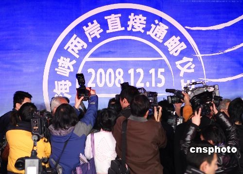 12月15日,由國家郵政局、國務院臺灣事務辦公室、北京市政府主辦、中國郵政集團承辦的海峽兩岸直接通郵儀式,標志著海峽兩岸將實現(xiàn)全面、直接、雙向通郵,直接開辦各項郵政業(yè)務。大陸方面郵件封局為北京、上海、廣州、福州、廈門、西安、南京、成都,臺灣方面郵件封局為臺北、高雄、基隆、金門、馬祖。圖為通郵儀式吸引眾多境內(nèi)外記者爭相采訪。中新社發(fā) 宋吉河 攝