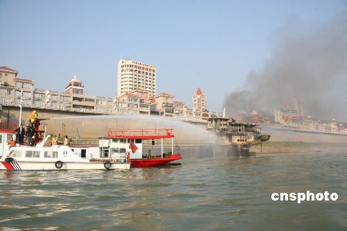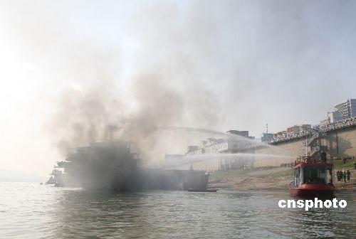 12月17日下午3時(shí)許,廣西梧州西江一貨船突起大火,機(jī)艙內(nèi)存有一噸柴油,隨時(shí)有爆炸的可能。梧州水上消防中隊(duì)10名官兵迅速出警,經(jīng)過30分鐘的撲救,大火被撲滅,無人員傷亡。中新社發(fā) 何永崇 攝