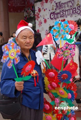 12月21日,隨著西方圣誕節(jié)臨近,廣西南寧市街頭圣誕氣氛漸濃,一位山寨版“圣誕老人”頭戴圣誕帽,在街頭販賣圣誕飾品及當(dāng)?shù)靥厣椘防C球等。中新社發(fā) 劉萬強(qiáng) 攝
