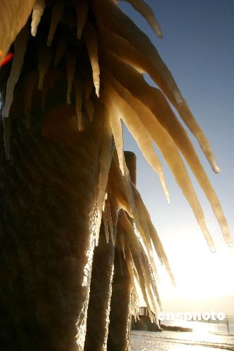 12月22日,受寒潮影響,江蘇連云港出現(xiàn)大風降溫天氣,最低氣溫零下8攝氏度。在偏北大風作用下,海上生成巨浪,濺在海岸邊護欄上的海水凍結(jié)成晶瑩剔透的冰凌。當?shù)貧庀蟛块T發(fā)布黃色寒潮預警,同時發(fā)出大風警報。中新社發(fā) 王健民 攝
