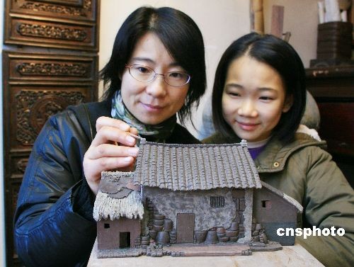 12月21日,市民正在欣賞紫砂雕塑《陶都特色民居》。為了再現(xiàn)昔日陶都特色建筑風(fēng)貌,江蘇宜興工藝美術(shù)師周定芳先后用4個(gè)多月的時(shí)間,以當(dāng)?shù)靥赜械淖仙澳嗨茉炝艘唤M造型各異的陶都特色民居,藝術(shù)地展示了宜興的地方風(fēng)情,觀者無不稱奇。宜興是我國著名的陶都,陶瓷業(yè)十分發(fā)達(dá),但生產(chǎn)過程中總會(huì)產(chǎn)生一些廢品,特別是過去窯爐較落后,廢品較多。在舊時(shí),當(dāng)?shù)厝罕姵S脧U棄或破碎的陶缸、陶甕、陶罐等作為建筑材料來建造墻壁等,造就出富有濃郁地方特色的陶都民居,成為宜興一絕。隨著時(shí)代的變遷,此種特色民居不斷被高樓大廈所替代,已越來越少。中新社發(fā) 丁煥新 攝