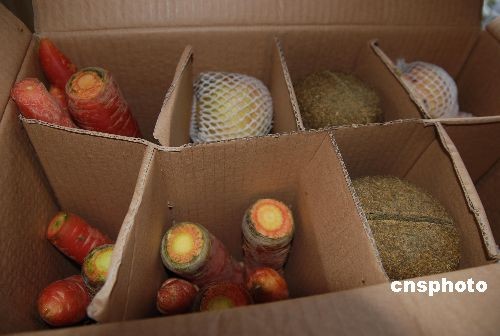 12月23日,贈臺大熊貓“團團”、“圓圓”離開雅安碧峰峽前往成都雙流國際機場。臺灣人民期盼已久的“團團”、“圓圓”,終于踏上了赴“寶島”臺灣之路。圖為大熊貓途中所用食物。中新社發(fā) 陳學梅 攝