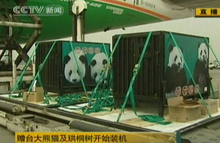 贈臺大熊貓“團(tuán)團(tuán)”、“圓圓”23日飛赴臺灣。大陸有關(guān)部門在成都雙流機(jī)場舉辦“贈臺大熊貓及珙桐樹赴臺歡送儀式”,目前儀式已結(jié)束,開始裝運(yùn)大熊貓和珙桐樹。