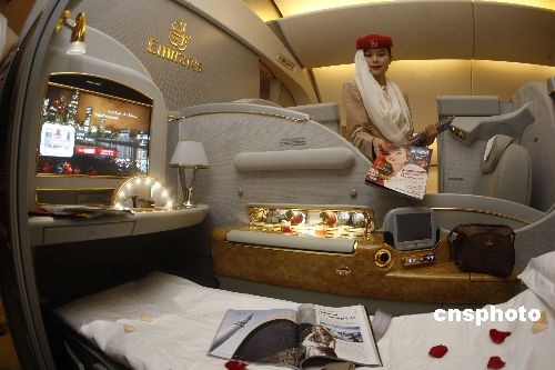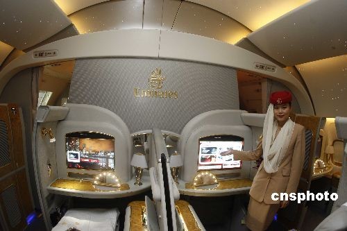 12月23日,“阿聯(lián)酋航空波音B777-200LR型飛機展示活動”在北京首都國際機場舉行,介紹其即將在北京往返迪拜的EK306/307航班上啟用波音B777-200LR型飛機,該機型安裝了頭等艙私人包間,可隨意開關(guān)的屏風為乘客打造極致私密的空間,并配備了個人專屬儲物空間、衣櫥、梳妝臺及個人迷你酒吧、加長型平躺座椅等。遍布機艙的 “星空模擬”情緒照明系統(tǒng)可以幫助乘客調(diào)整生物鐘,減少因倒時差而帶來的身體不適。圖為美麗空姐介紹頭等艙私人包間特色細節(jié)。中新社發(fā) 盛佳鵬 攝