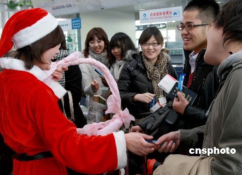 12月24日,圣誕節(jié)前夕,青島國際機場節(jié)日氣氛濃厚,工作人員裝扮成“圣誕女郎”和“可愛熊貓”,向日本游客送上節(jié)日祝福,歡送他們回國與家人團聚過平安夜。中新社發(fā) 鄭雄增 攝