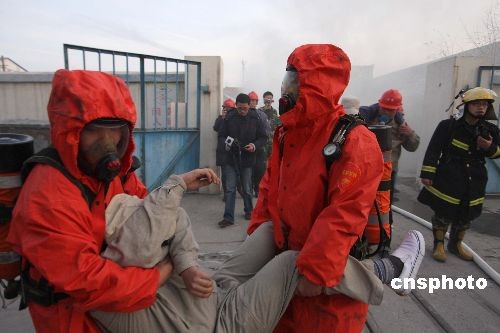 12月27日,江蘇連云港海州區(qū)人防辦聯(lián)合消防、安監(jiān)、衛(wèi)生、環(huán)保等單位在海州區(qū)德邦精細(xì)化工廠舉行學(xué)品事故處理應(yīng)急演練,旨在通過(guò)演練,提高企業(yè)節(jié)日期間突發(fā)性事故應(yīng)急處置能力。中新社發(fā) 穆道勇 攝