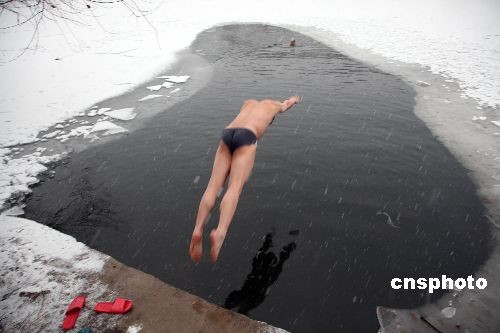 12月下旬,沈陽市北陵公園人工湖,一批冬泳愛好者換上泳衣,在刺骨的寒風(fēng)中面對泛著冰碴的湖水一躍而下演繹出美麗“凍”人的一幅畫面。一名老冬泳愛好者告訴記者,冬泳開始練習(xí)時難免有些困難要克服,但克服困難后的樂趣是普通人無法體會的,“希望更多的年輕人加入到這個隊伍中,可以鍛煉我們整個民族的意志!敝行律绨l(fā) 黃金昆 攝