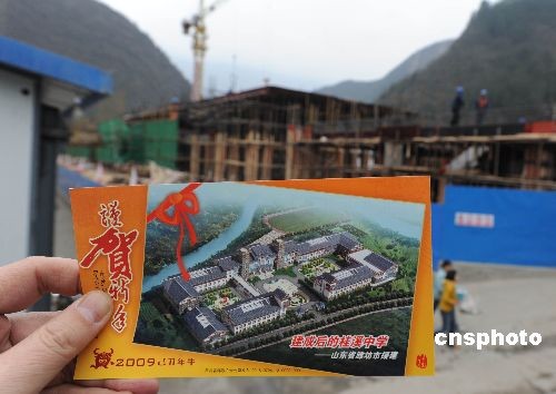 胡總書記12月27日到北川縣桂溪中學(xué)考察看望時,一位羌族女學(xué)生向臨告別時的總書記送上一封信和這張學(xué)校震后重建規(guī)劃圖的賀年片。圖為羌族學(xué)生展示送給胡總書記的賀年片。中新社發(fā) 賈國榮 攝