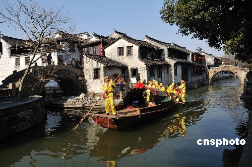 2009周莊開莊大典今日隆重舉行,吸引海內(nèi)外游客駐足觀賞。龍舞獅躍、鑼鼓震天、身穿彩袍、腳瞪皂靴的周莊巨賈“沈萬三”攜丫鬟、家丁百余人親自開莊迎客,并一路引著四海賓客巡游古鎮(zhèn)。具有傳統(tǒng)意義的開莊大典是對周莊文化旅游的又一次補充和延伸。中新社發(fā) 張衛(wèi)青 攝