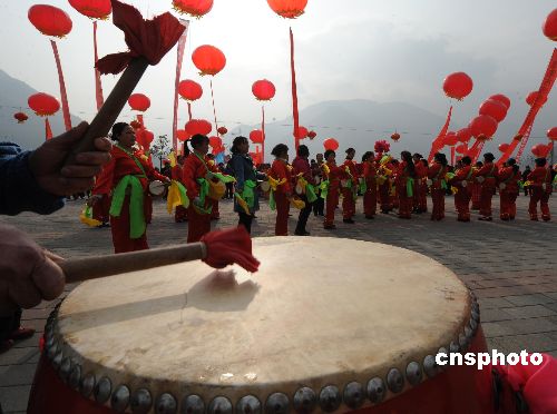 四川汶川大地震極重災區(qū)北川縣擂鼓鎮(zhèn)由災民組成的腰鼓隊,2009年元旦節(jié)日期間載歌載舞,在余震中辭舊迎新。據(jù)四川省地震臺網(wǎng)測定,1月2日晚7時,四川省綿陽市北川縣又發(fā)生一次4.7級地震,這次余震持續(xù)時間較短,但成都市區(qū)、眉山市、德陽市等地有明顯震感。中新社發(fā) 賈國榮 攝