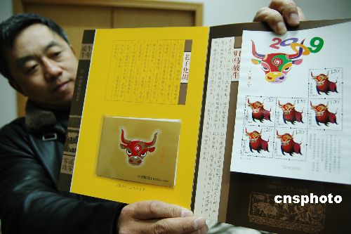 2009年1月4日,即將發(fā)行的《己丑年》特種郵票運(yùn)抵蘇州。據(jù)悉,國家郵政局和中國郵政集團(tuán)公司將于1月5日在蘇州首發(fā)該套以“奔牛”為形象的《己丑年》特種郵票。該次發(fā)行的《己丑年》郵票一套一枚,面值1.2元。郵票圖案為健壯倔強(qiáng)的奔牛形象,表現(xiàn)出奮力向前的視覺效果,寓意人們對生肖牛年的期望與寄托。中新社發(fā) 朱子寒 攝