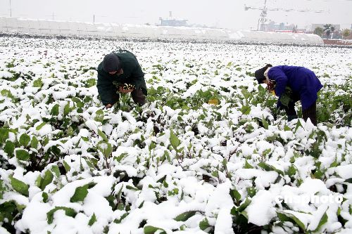 1月6日,湖北省枝江市市民正在采摘蔬菜。據(jù)氣象部門發(fā)布的信息表明,5日至6日,湖北省的西部地區(qū)普降中雪,省政府辦公廳已下發(fā)緊急通知,要求各市、州、縣人民政府,省政府有關(guān)部門認(rèn)真做好應(yīng)對(duì)低溫凍害工作。中新社發(fā) 柳月 攝